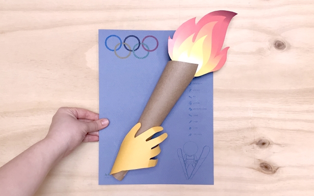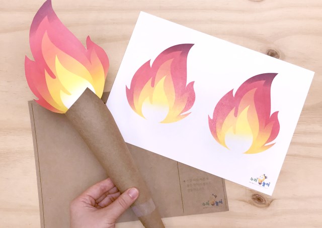 2) 성화대 도안을 오려서 돌돌 말고, 불 도안을 붙인다.