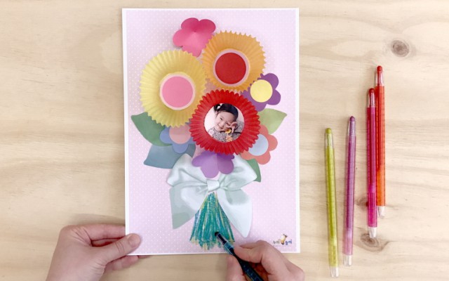 4) 컵케이크 유산지와 오린 도안을 모아 붙이고 색연필로 꾸민다.