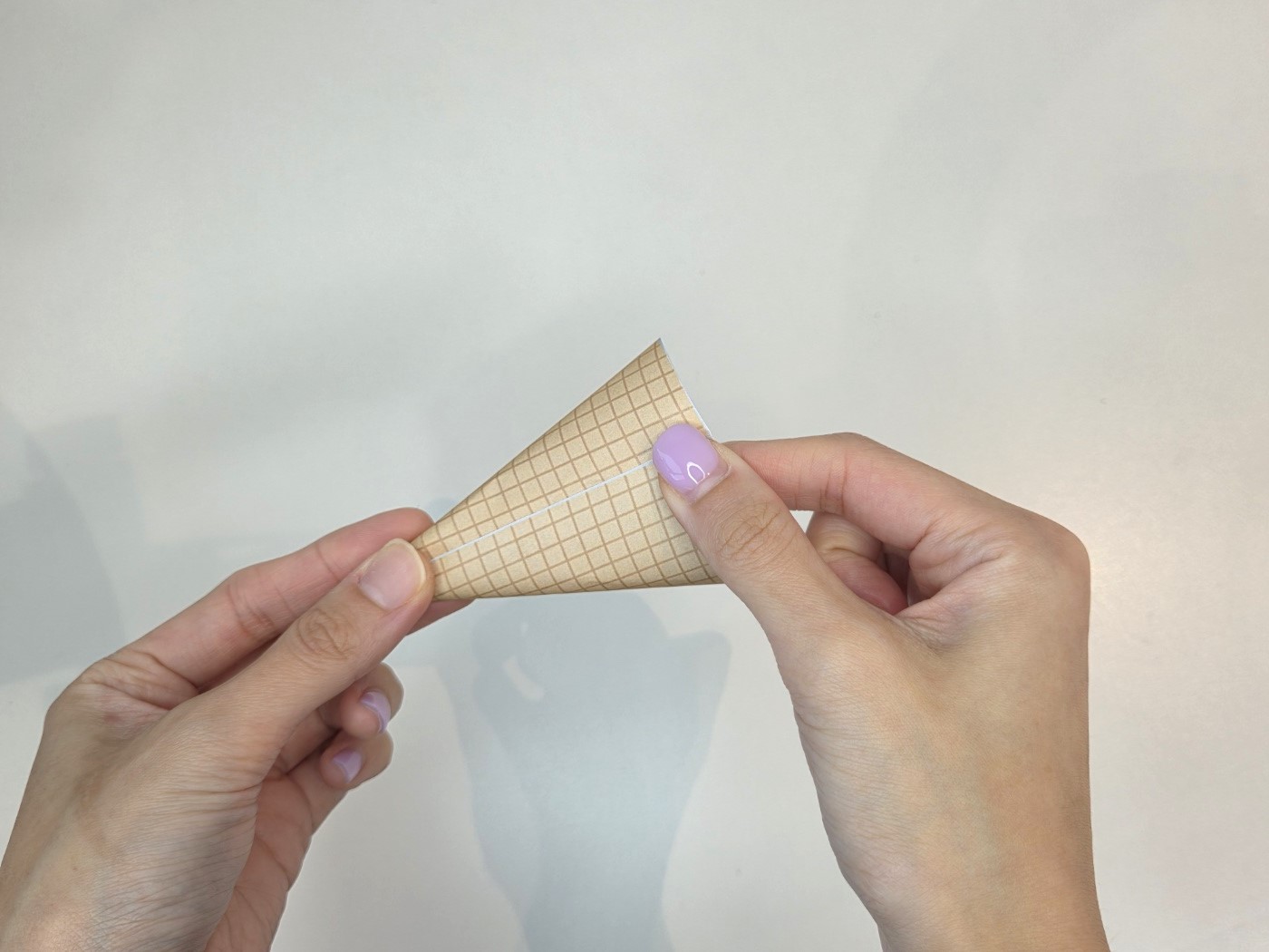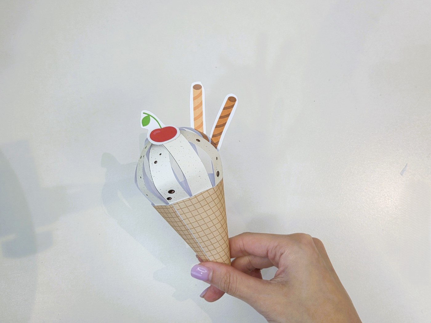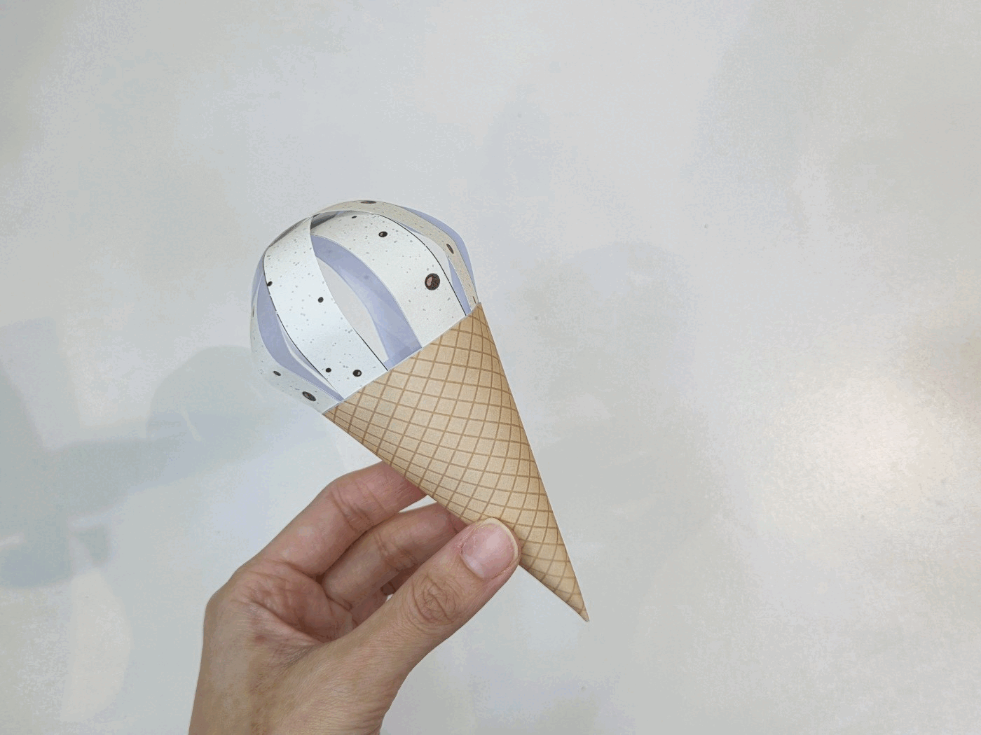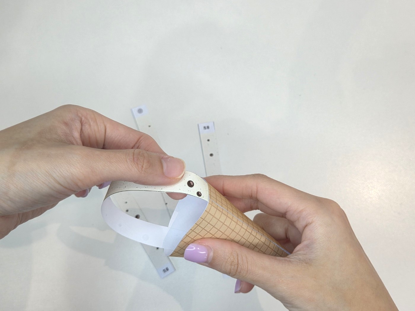 ▲ 아이스크림 도안을 구부려 반대쪽 끝도 콘의 안쪽에 붙여 주세요.